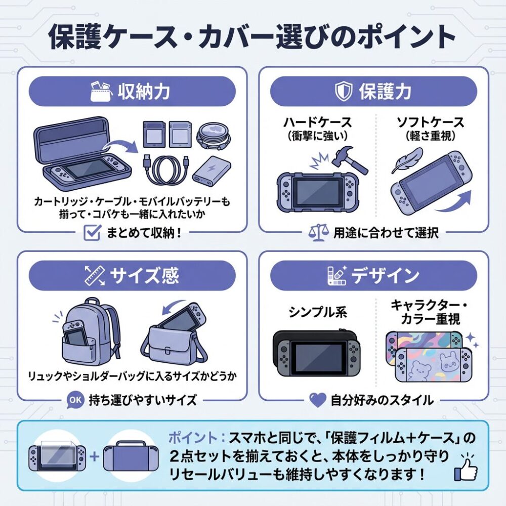 改めて整理すると、Switch2 周辺機器は「本体を守る」「熱とネットを安定させる」「操作性・映像・音・姿勢を整える」「どこでも遊べるようにする」という4つの役割に分けられます。