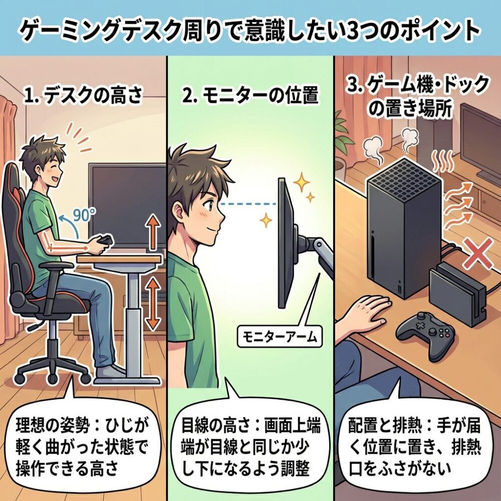 ラグや切断を減らし、オンライン対戦を安定させるための投資です。 - 必要に応じてゲーミングデスク・モニターアーム
