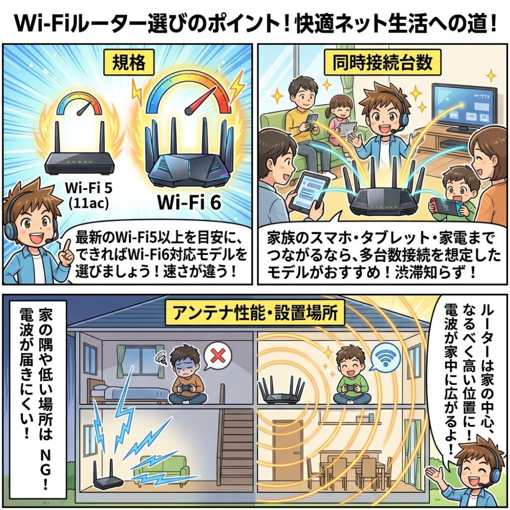 家族のスマホ・タブレット・家電までつながるなら、多台数接続を想定したモデルがおすすめです。 - アンテナ性能・設置場所
