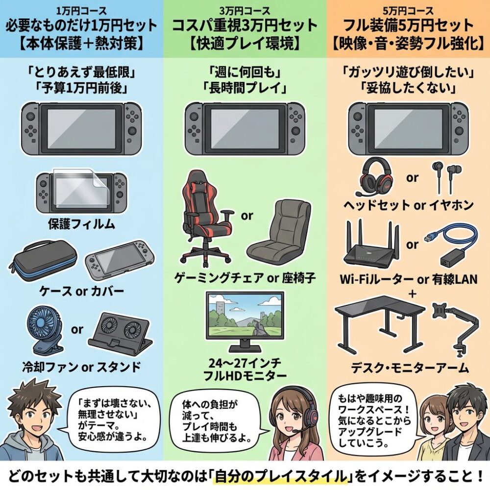 ここまで紹介してきたSwitch2 周辺機器・ガジェットを踏まえて、「結局どれから買えばいいの?」という人向けに、目的別・予算別のおすすめセットをまとめておきます。